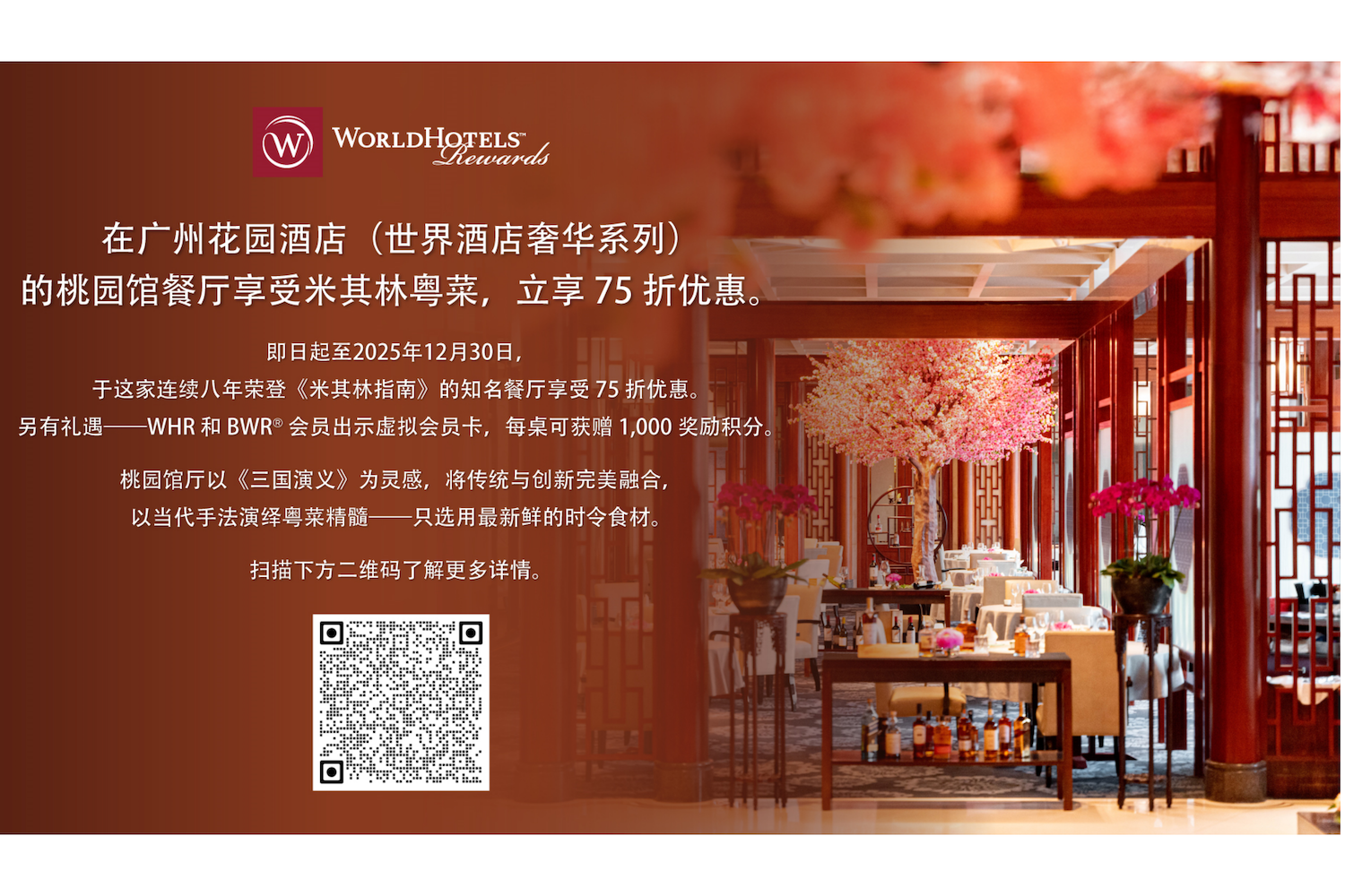 WORLDHOTELS会员在广州花园酒店(世界酒店奢华系列)的桃桃园馆餐厅享受米其林粤菜,立享75折优惠。